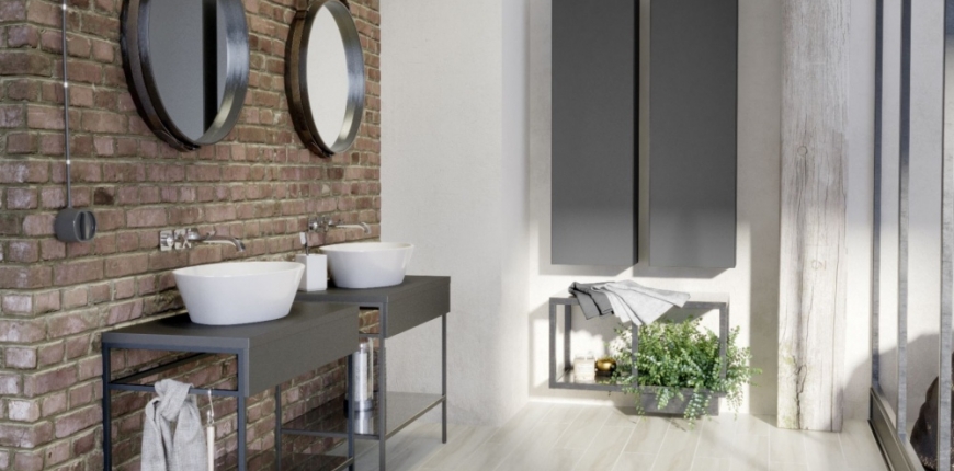 Styl industrialny operuje sporą liczbą środków aranżacyjnych, wiele z nich można wykorzystać w łazience w stylu loftowym. Z materiałów wykończeniowych mamy m.in. beton architektoniczny i naśladujące go produkty, surową cegłę i kamień oraz niewykończone drewno. Okładziną numer jeden na ściany w łazience loftowej jest beton architektoniczny oraz inne materiały go naśladujące, przede wszystkim płytki ceramiczne płytki ceramiczne oraz gres wielkoformatowy imitujący betonowe płyty. Aby uzyskać efekt betonu na ścianie włazience w stylu loftowym można wykorzystać także tynk o strukturze betonu, farbę do ścian lub tapetę. Zróżnicowana powierzchnia betonu, ilość jego odcieni, żyłki i pory występujące na jego powierzchni, ślady szalunku – to wszystko sprawia, że dzięki betonowej lub imitującej beton okładzinie ściana nabiera industrialnego charakteru. W zależności od użytego sposobu uzyskania betonowej nawierzchni wyeksponowane są różne jego elementy: kolor w wielu odcieniach szarości, faktura gładka lub chropowata, połyskująca lub matowa powierzchnia, printy technologiczne. Drugim po betonie charakterystycznym dla stylu industrialnego materiałem jest cegła. W starych domach i mieszkaniach łatwo uzyskać ten atrakcyjny element aranżacji – w budynkach murowanych z cegły wystarczy podczas remontu odsłonić kawałek oryginalnej ściany. By tak uzyskana ceglana ściana stała się dekoracją łazienki loftowej, mur trzeba wyczyścić, a następnie zabezpieczyć odpowiednim impregnatem.